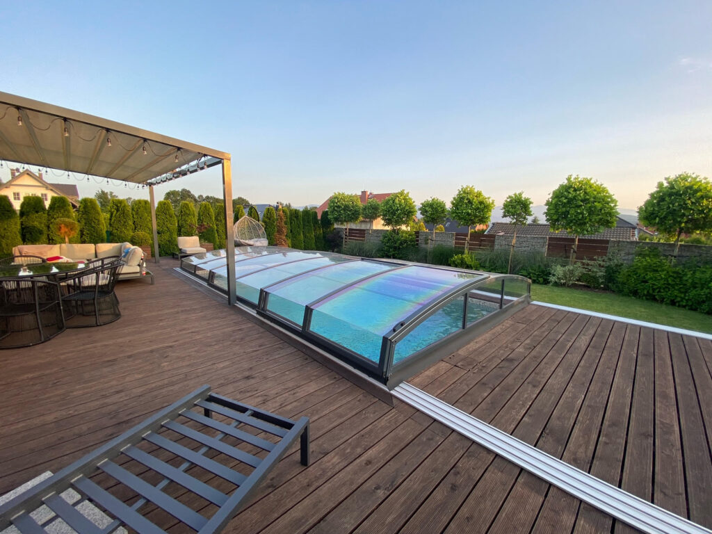 Zadaszenie basenowe pomaga również w utrzymaniu wyższej temperatury wody, ograniczając jej wychładzanie w nocy lub podczas chłodniejszych dni. Woda w basenie może być cieplejsza nawet o 8°C, co sprawia, że sezon kąpielowy można wydłużyć o kilka miesięcy. Zadaszenie z napędem zapewnia też większą prywatność, zamieniając Twój ogród w przestrzeń do relaksu i odpoczynku, dostępną wyłącznie dla Ciebie i Twoich bliskich.